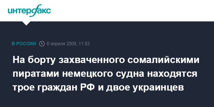 Москва. 6 апреля. INTERFAX.RU – В экипаж захваченного сомалийскими пиратами немецкого контейнеровоза входят трое россиян: старший помощник и второй механик из Петербурга, старший механик из Калининграда, заявил "Интерфаксу" главный редактор издания "Морской бюллетень - Совфрахт", Михаил Войтенко.