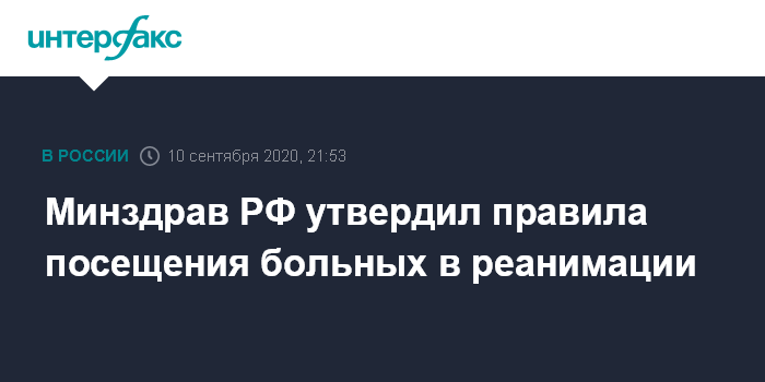 Москва. 10 сентября. INTERFAX.RU - Минздрав России утвердил правила, по которым пациентов в отделениях интенсивной терапии смогут посещать близкие и друзья.