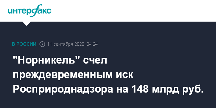 Москва. 11 сентября. INTERFAX.RU - "Норильский никель" считает обращение Росприроднадзора с иском в суд о возмещении вреда окружающей среде в размере 147,78 млрд рублей преждевременным, следует из заявления на сайте компании.