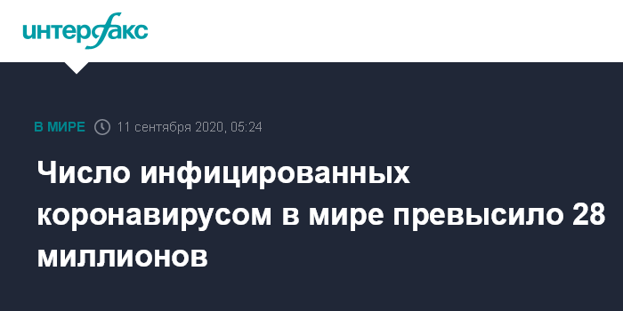Москва. 11 сентября. INTERFAX.RU - Количество случаев заражения коронавирусом в мире достигло в ночь на пятницу 28 054 396, свидетельствуют данные американского университета Джонса Хопкинса.