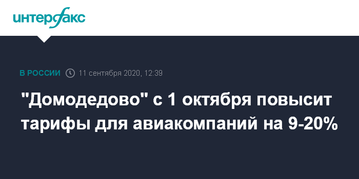 Москва. 11 сентября. INTERFAX.RU - Московский аэропорт "Домодедово" с 1 октября 2020 года повысит основные тарифы на обслуживание российских авиакомпаний. Индексация составит от 9 до 20% в зависимости от тарифа, следует из материалов аэропорта.