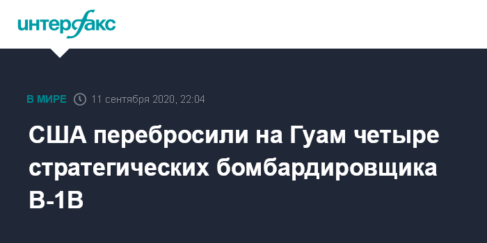 Москва. 11 сентября. INTERFAX.RU - Соединенные Штаты перебросили на базу Андерсен на острове Гуам в западной части Тихого океана оперативную группу из четырех стратегических бомбардировщиков B-1B, сообщило командование ВВС США на Тихом океане.