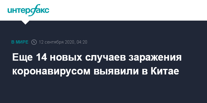 Москва. 12 сентября. INTERFAX.RU - За истекшие сутки в Китае зафиксированы 14 новых инфицированных COVID-19: шесть больных в активной форме и восемь бессимптомных носителей, все случаи "импортированы", сообщил Госкомздрав КНР на своем официальном сайте.