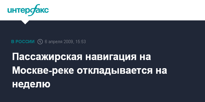 Москва. 6 апреля. INTERFAX.RU - Сроки начала пассажирской судоходной кампании на Москве-реке перенесены с 10 на 17 апреля, сообщила в понедельник "Интерфаксу" заместитель генерального директора по рекламе и связям с общественностью "Столичной судоходной компании" Юлия Ефремова.