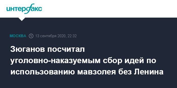 Москва. 13 сентября. INTERFAX.RU - Коммунистическая партия Российской Федерации (КПРФ) рассматривает как провокацию предложение Союза архитекторов России о конкурсе на концепцию ре-использования мавзолея Ленина, заявил председатель ЦК КПРФ Геннадий Зюганов.
