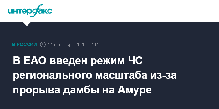Москва. 14 сентября. INTERFAX.RU - В Еврейской автономной области ввели режим чрезвычайной ситуации регионального характера из-за прорыва дамбы на Амуре в селе Ленинское. Об этом сообщила пресс-служба правительства региона.