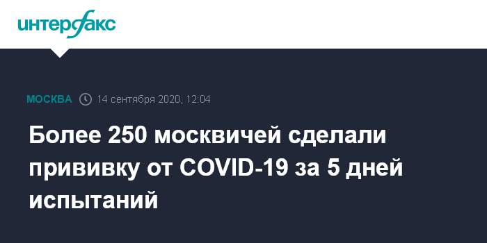 Москва. 14 сентября. INTERFAX.RU - За пять дней исследования вакцины от коронавирусной инфекции привились более 250 москвичей, сообщили "Интерфаксу" в городском оперативном штабе в понедельник.