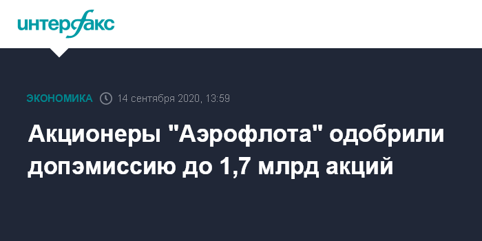 Москва. 14 сентября. INTERFAX.RU - Акционеры "Аэрофлота" на внеочередном собрании 11 сентября одобрили дополнительное размещение по открытой подписке до 1,7 млрд акций, следует из сообщения авиакомпании.