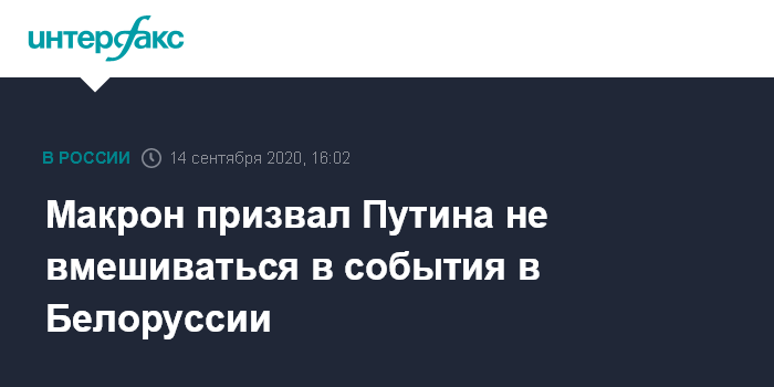Москва. 14 сентября. INTERFAX.RU - Президент Франции Эммануэль Макрон призвал Россию не вмешиваться в белорусский кризис. Как сообщает Bloomberg, он сказал это в ходе телефонных переговоров с президентом Владимиром Путиным 14 сентября.