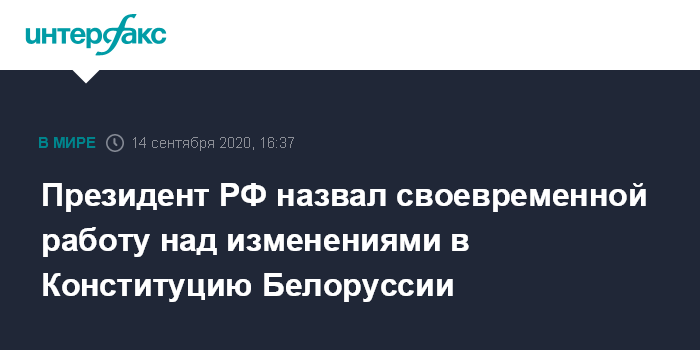 Москва. 14 сентября. INTERFAX.RU - Президент РФ Владимир Путин заявил, что считает начатую в Белоруссии работу над конституционными изменениями логичной и своевременной.