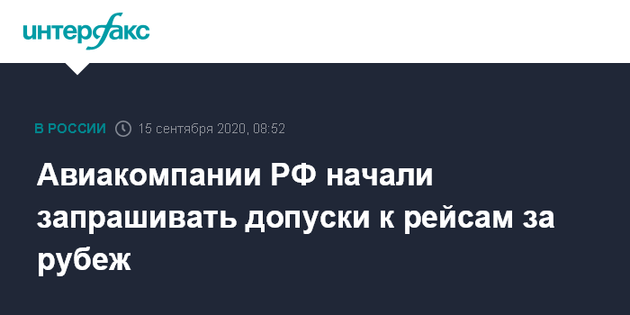 Москва. 15 сентября. INTERFAX.RU - Росавиация впервые за время пандемии COVID-19 анонсировала заседание межведомственной комиссии при Минтрансе, распределяющей допуски на полеты за рубеж. Согласно опубликованным материалам, российские перевозчики хотят получить право летать не только в открытые правительством страны, но и запастись допусками в еще закрытые.