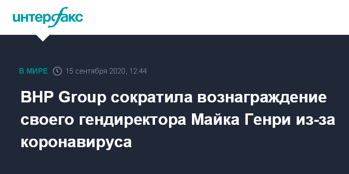 Москва. 15 сентября. INTERFAX.RU - Пандемия коронавируса, которая привела к росту расходов на ключевые проекты горнодобывающей BHP Group и сокращению добычи, негативно сказалась и на вознаграждении ее гендиректора Майка Генри.