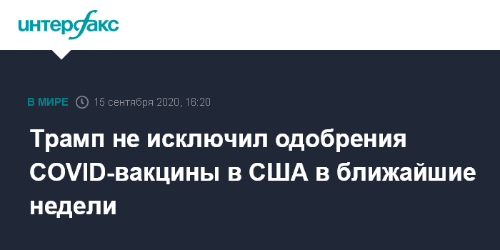 Москва. 15 сентября. INTERFAX.RU - Президент США Дональд Трамп заявил, что вакцина от коронавируса будет одобрена в течение нескольких ближайших недель.