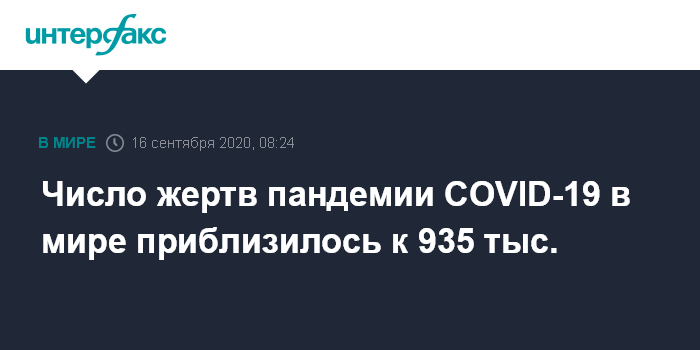 Число жертв от связанных с вирусом заболеваний в мире составило 934 986 человек против 927 245 сутками ранее, излечились 20 млн, сообщает университет.