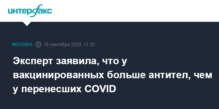 Москва. 16 сентября. INTERFAX.RU - Вакцина от коронавируса дает уровень антител в несколько раз выше, чем у переболевших, сказала главный врач Инфекционной больницы №1, главный инфекционист Москвы Светлана Сметанина, которая прошла вакцинацию.