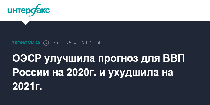 Москва. 16 сентября. INTERFAX.RU - Организация экономического сотрудничества и развития (ОЭСР) улучшила прогноз для ВВП России на 2020 год и ухудшила прогноз на 2021 год.