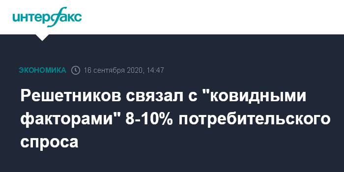 Москва. 16 сентября. INTERFAX.RU - Вклад краткосрочных факторов в экономике - отложенного спроса, закрытия границ, периода отпусков, мер господдержки - составил 8-10% в поддержку потребительского спроса в России, заявил министр экономического развития Максим Решетников. Он представляет правительству уточненный макропрогноз.