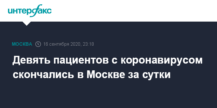 Москва. 16 сентября. INTERFAX.RU - Еще девять человек с подтвержденным диагнозом пневмония и положительным результатом тестов на коронавирус скончались в Москве за сутки, сообщили "Интерфаксу" в столичном оперштабе по контролю и мониторингу ситуации с коронавирусом.