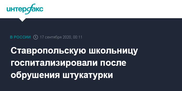 Москва. 17 сентября. INTERFAX.RU - В Ставрополе на ученицу в школе обрушился пласт штукатурки, пострадавшая госпитализирована, сообщила пресс-служба СУ СКР по Ставропольскому краю.