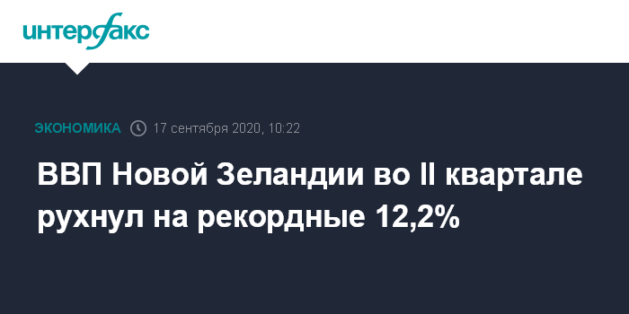 Москва. 17 сентября. INTERFAX.RU - ВВП Новой Зеландии во втором квартале рухнул на 12,2% относительно предыдущих трех месяцев, сообщило статистическое управление страны в четверг.