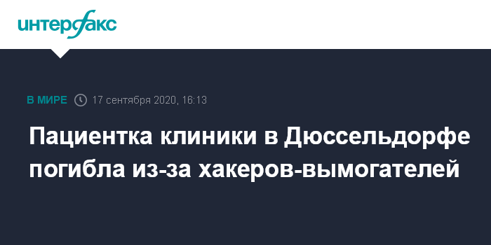 Москва. 17 сентября. INTERFAX.RU - В Дюссельдорфе полиция расследует смерть пациентки из клиники Uniklinik, которая умерла в период, когда хакерская атака парализовала работу этого учреждения, сообщает Focus. Инцидент расследуется как непредумышленное убийство, уточняет Sueddeutsche Zeitung.