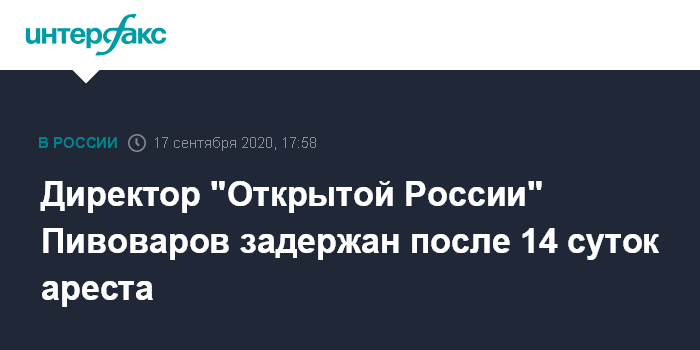 Москва. 17 сентября. INTERFAX.RU - Полиция задержала исполнительного директора "Открытой России" Андрея Пивоварова на выходе из спецприемника, где он отбывал арест на 14 суток, сообщила организация в четверг.