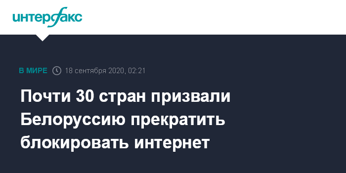 Москва. 18 сентября. INTERFAX.RU - Сразу 29 стран во главе с США призывают власти Белоруссии воздержаться от отключения интернета и соблюдать обязательства страны в области прав человека.