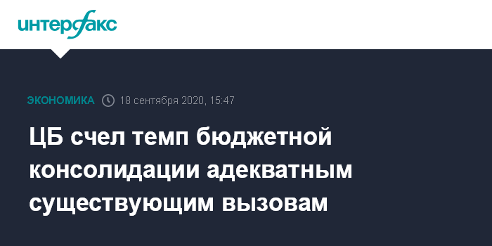 Москва. 18 сентября. INTERFAX.RU - Банк России согласен с выбранным правительством темпом бюджетной консолидации на ближайшие годы, считает его адекватным экономическому развитию и существующим вызовам, сообщила глава ЦБ Эльвира Набиуллина.