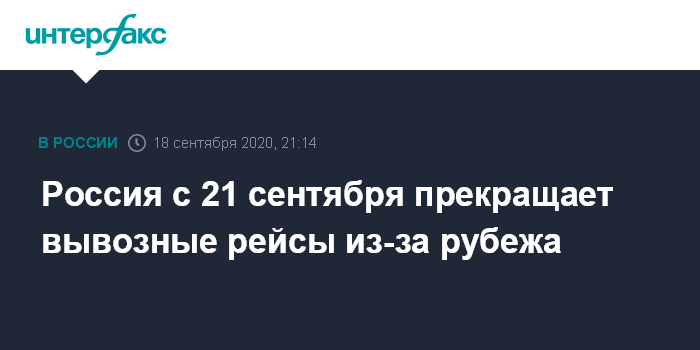 Москва. 18 сентября. INTERFAX.RU - Российский оперативный штаб по предупреждению распространения коронавирусной инфекции принял решение о прекращении с 21 сентября программы вывозных рейсов в связи с возобновлением транспортного сообщения между государствами.
