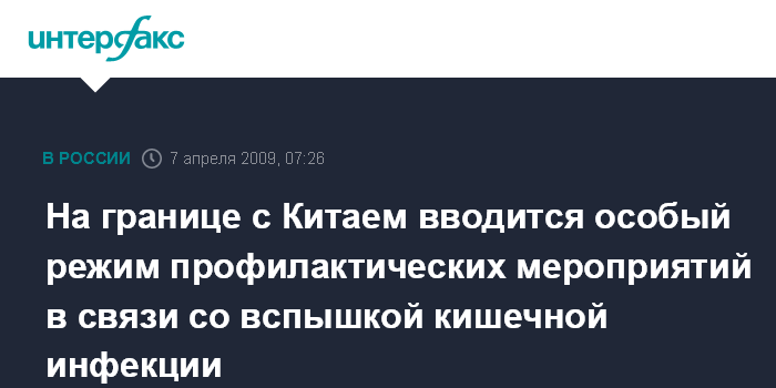 "Мы дали указание регионам, чтобы они обратили внимание на вспышку кишечной инфекции в Китае. В субъектах РФ, граничащих с Китаем, вводится особый режим на границе", - сказал Г.Онищенко.