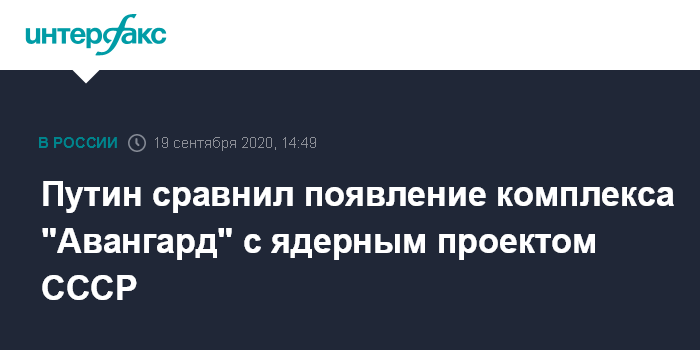Москва. 19 сентября. INTERFAX.RU - Постановка на боевое дежурство ракетного комплекса "Авангард" сравнима с реализацией ядерного проекта в СССР, заявил президент РФ Владимир Путин.