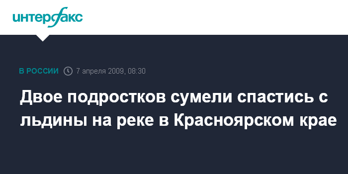 Москва. 7 апреля. INTERFAX.RU - Два школьника из города Зеленогорска (Красноярский край) оказались на отколовшейся льдине, которая начала дрейфовать по реке. Мальчикам удалось спастись.