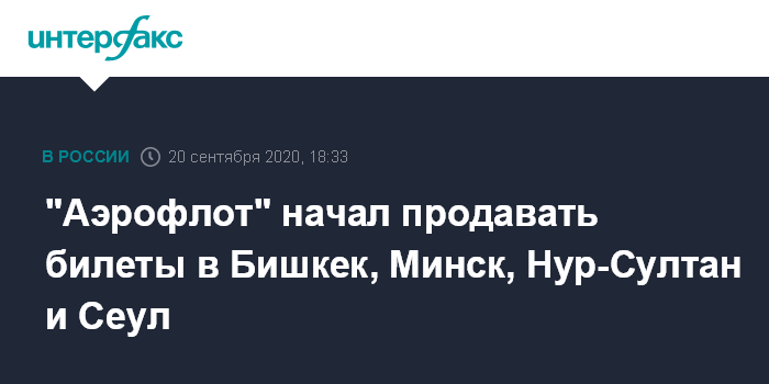 Москва. 20 сентября. INTERFAX.RU - "Аэрофлот" открыл на своем сайте продажу билетов из Москвы в Бишкек (Киргизия), Минск (Белоруссия), Нур-Султан (Казахстан) и Сеул (Южная Корея).