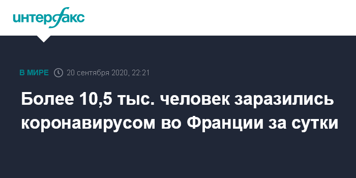 Москва. 20 сентября. INTERFAX.RU - Врачи во Франции зафиксировали за стуки 10 569 случаев заболевания коронавирусом COVID-19, свидетельствуют опубликованные в воскресенье вечером официальные данные.