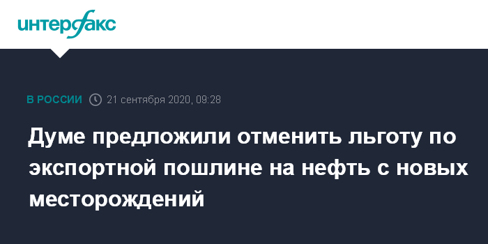 Москва. 21 сентября. INTERFAX.RU - Правительство предложило Госдуме с 1 января 2021 года отменить льготы по экспортной пошлине для нефти с особыми физико-техническими характеристикам, добываемой на 15 месторождениях Восточной Сибири и Каспии, а также льготу по пошлине на сверхвязкую нефть.