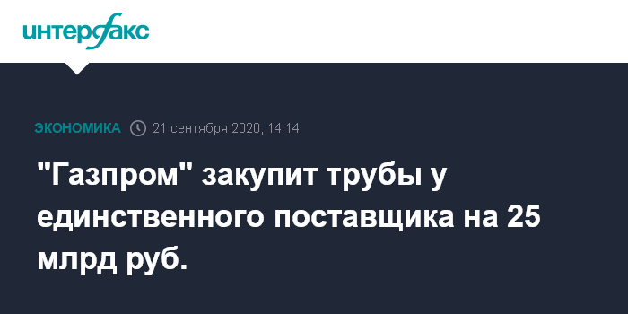Москва. 21 сентября. INTERFAX.RU - ООО "Газпром комплектация" сообщило о подготовке к заключению договора с единственным поставщиком на поставку труб большого диаметра (ТБД) на сумму 24,75 млрд рублей.