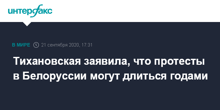 Москва. 21 сентября. INTERFAX.RU - Экс-кандидат в президенты Белоруссии Светлана Тихановская заявила, что протесты в республике будут продолжаться столько времени, сколько потребуется, это может занять годы.