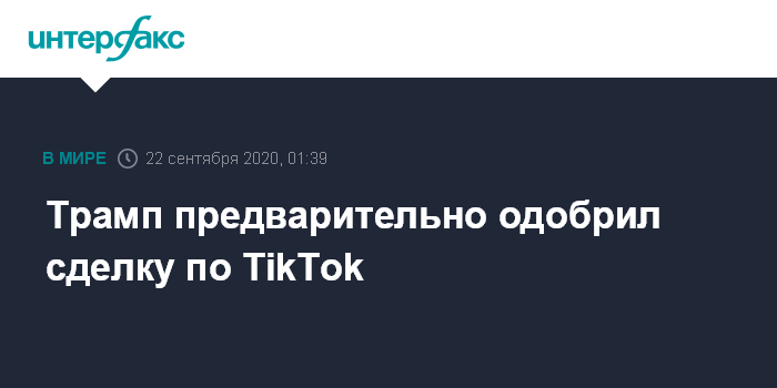 Москва. 22 сентября. INTERFAX.RU - Президент США Дональд Трамп заявил о предварительном согласии на сделку по китайской социальной сети TikTok.