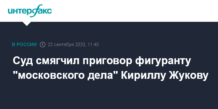 Москва. 22 сентября. INTERFAX.RU - Второй кассационный суд общей юрисдикции снизил срок наказания фигуранту "московского дела" Кириллу Жукову до 2,5 лет, а также перевел его из колонии общего режима в колонию-поселение, сообщила "Интерфаксу во вторник" адвокат "Апологии протеста" Светлана Байтурина.