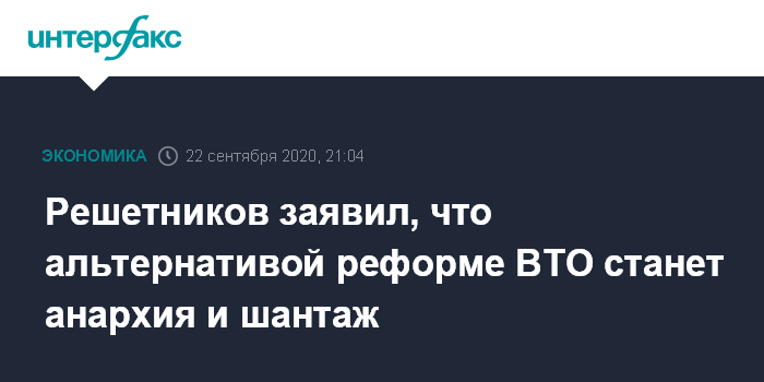 Москва. 22 сентября. INTERFAX.RU - РФ выступает за скорейшую реформу Всемирной торговой организации (ВТО), иначе усиливаются риски одностороннего протекционизма, анархии и грубого экономического шантажа. Об этом заявил глава Минэкономразвития Максим Решетников в ходе встречи министров торговли "Группы двадцати", которая прошла во вторник в формате телеконференции.