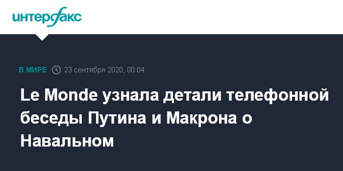 14 сентября Кремль сообщил, что Путин и Макрон в ходе телефонного разговора обсудили, в частности, ситуацию вокруг "дела Алексея Навального". Российский лидер "подчеркнул неуместность голословных, ни на чем не основанных обвинений российской стороны в данном контексте", говорилось в сообщении. В пресс-службе Кремля подчеркивали, что в ходе разговора "акцентировано, что в целях выяснения реальных обстоятельств произошедшего требуется передача германскими специалистами в Россию биоматериалов, официального заключения по результатам взятых у Навального анализов, а также налаживание совместной работы с российскими врачами".