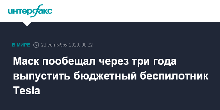 Москва. 23 сентября. INTERFAX.RU - Основатель Tesla Илон Маск пообещал, что "года через три" компания будет выпускать доступный электромобиль-беспилотник стоимостью $25 000 (1,9 млн рублей по нынешнему курсу). Как передает ВВС, он сказал об этом на презентации для акционеров Battery Day, посвященной запуску производства новых мощных батарей.