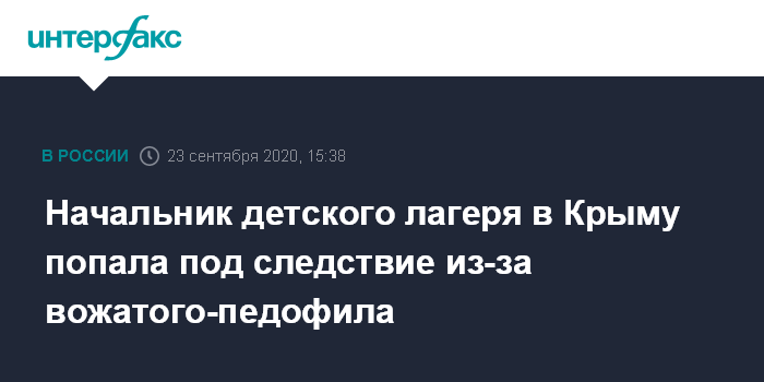 Москва. 23 сентября. INTERFAX.RU - Руководитель детского лагеря в Евпатории стала фигуранткой уголовного дела, поскольку один из вожатых совершил в отношении ребенка действия сексуального характера, сообщила пресс-служба ГСУ СКР по республике в среду.