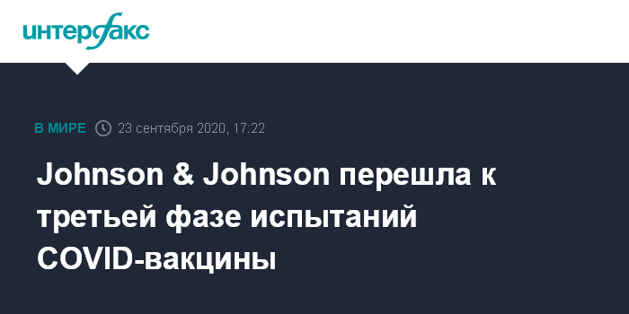 Москва. 23 сентября. INTERFAX.RU - Американская компания Johnson & Johnson начинает третью стадию клинических испытаний вакцины от коронавируса COVID-19, сообщают американские СМИ.