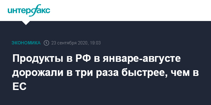 Москва. 23 сентября. INTERFAX.RU - Рост цен на продукты питания в РФ за январь-август 2020 года составил 3,9%, в то время как в ЕС продовольствие стало дороже на 1,3%, следует из опубликованных в среду данных Федеральной службы статистики (Росстат).