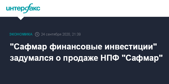 Москва. 24 сентября. INTERFAX.RU - ПАО "Сафмар финансовые инвестиции" рассматривает возможность продажи своего НПФ "Сафмар", который является одним из крупнейших частных негосударственных пенсионных фондов, сообщили "Интерфаксу" несколько источников, знакомых с переговорами.