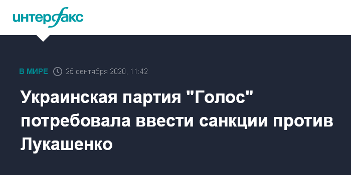 Москва. 25 сентября. INTERFAX.RU - Партия "Голос" требует созвать заседание Совета нацбезопасности и обороны Украины и ввести персональные санкции против президента Беларуси Александра Лукашенко, которого ЕС и США не признают законно избранным, а также против его окружения, которое фальсифицировало результаты президентских выборов, сообщает пресс-служба одноименной фракции.