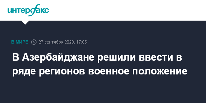 Москва. 27 сентября. INTERFAX.RU - Милли Меджлис (парламент) Азербайджана в воскресенье принял решение о введении военного положения, в ряде регионов страны будет введен комендантский час, сообщают азербайджанские СМИ.