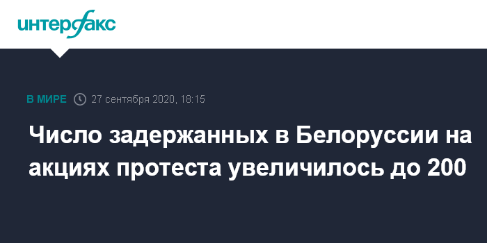 Москва. 27 сентября. INTERFAX.RU - В ходе несанкционированных массовых мероприятий в Белоруссии в воскресенье число задержанных, по последним данным, увеличилось и составило около 200 человек, сообщила "Интерфаксу" официальный представитель МВД Ольга Чемоданова.