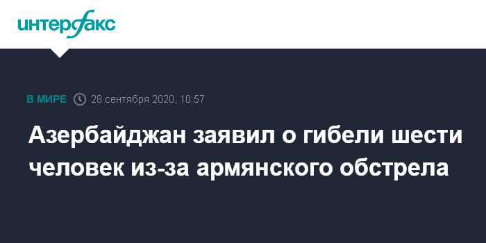 Москва. 28 сентября. INTERFAX.RU - Жертвами артиллерийских обстрелов со стороны Вооруженных сил Армении в азербайджанских населенных пунктах стали шесть мирных жителей, заявил в понедельник глава МИД Азербайджана Джейхун Байрамов.